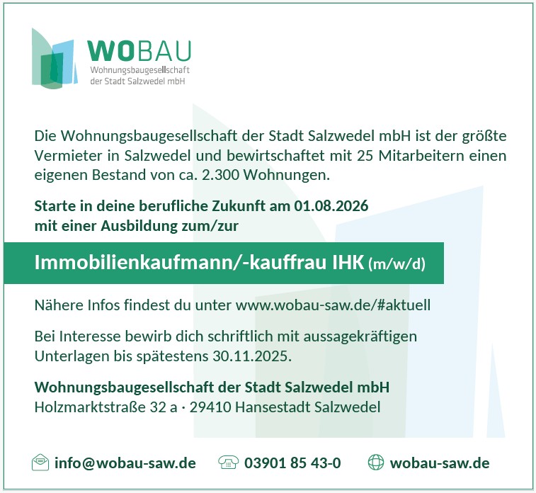 Als 100%ige Tochtergesellschaft der Hansestadt Salzwedel sind wir uns unserer sozialen Verantwortung bewusst. Die WoBau bietet allen Menschen ein Dach über dem Kopf – ohne Ansehen der Herkunft, des Geschlechts, der Religion oder Weltanschauung, einer Behinderung, des Alters oder der sexuellen Identität.